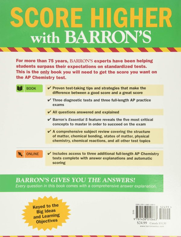 Extensive test preparation for the AP Chemistry exam includes: Six practice exams: three diagnostic tests and three full-length AP practice exams that are aligned with the upcoming, new AP Chemistry exam All questions answered and explained A comprehensive subject review covering the structure of matter, chemical bonding, states of matter, physical chemistry, chemical reactions, and all other test topics Study tips and test-taking strategies BONUS ONLINE PRACTICE TEST: Students who purchase this book or package will also get FREE access to three additional full-length online AP Chemistry tests with all questions answered and explained. The online exams can be easily accessed by computer, tablet, and smartphone.