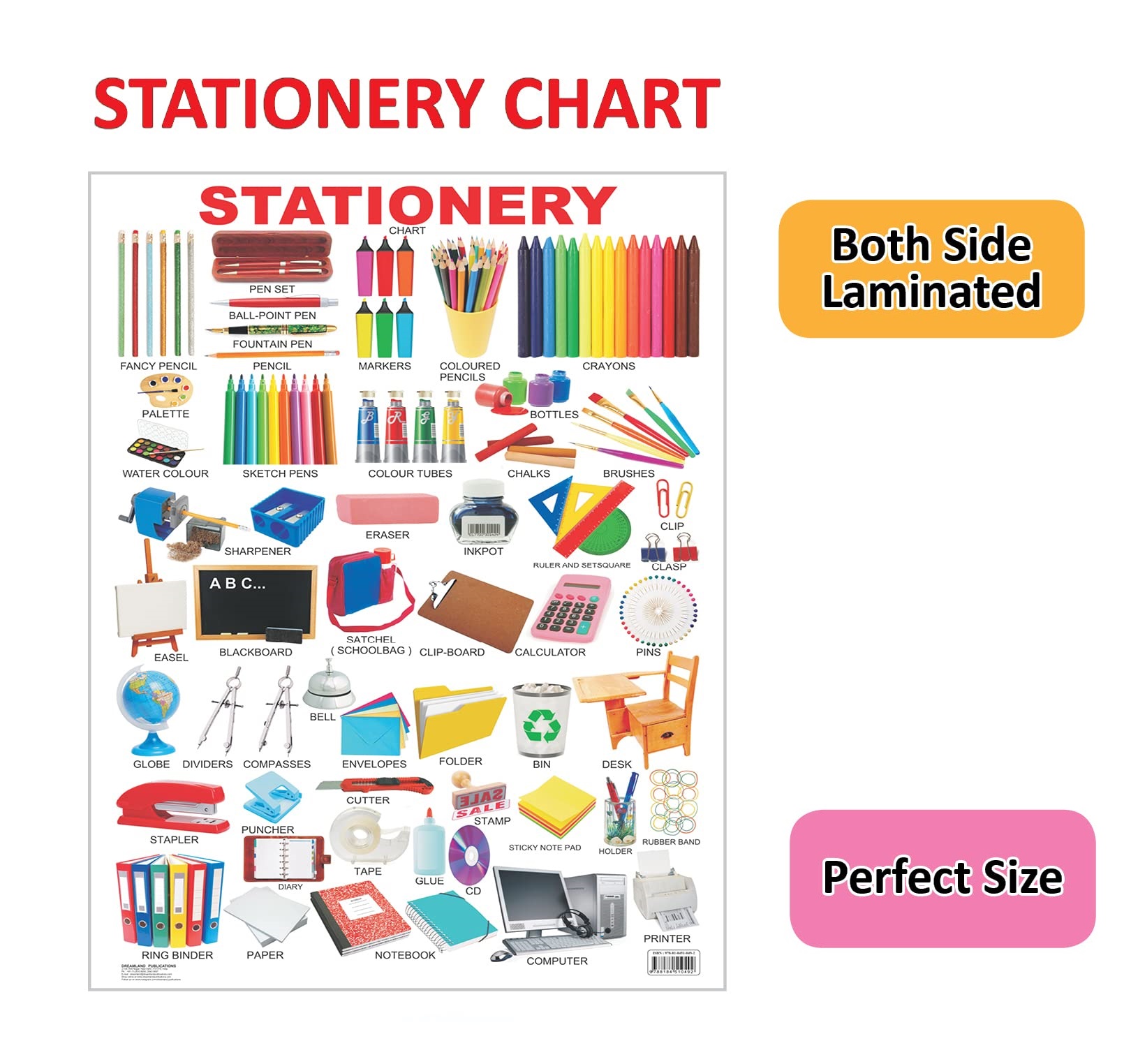 Stationery refers to paper products and other writing tools used by children in schools or office supplies. Perfect for early learners, Stationery both-side laminated education wall chart will introduce kids to various stationery products. Beautiful engaging colourful tools shown in the chart with their names will quickly help children know the names of their day-to-day stationery products.