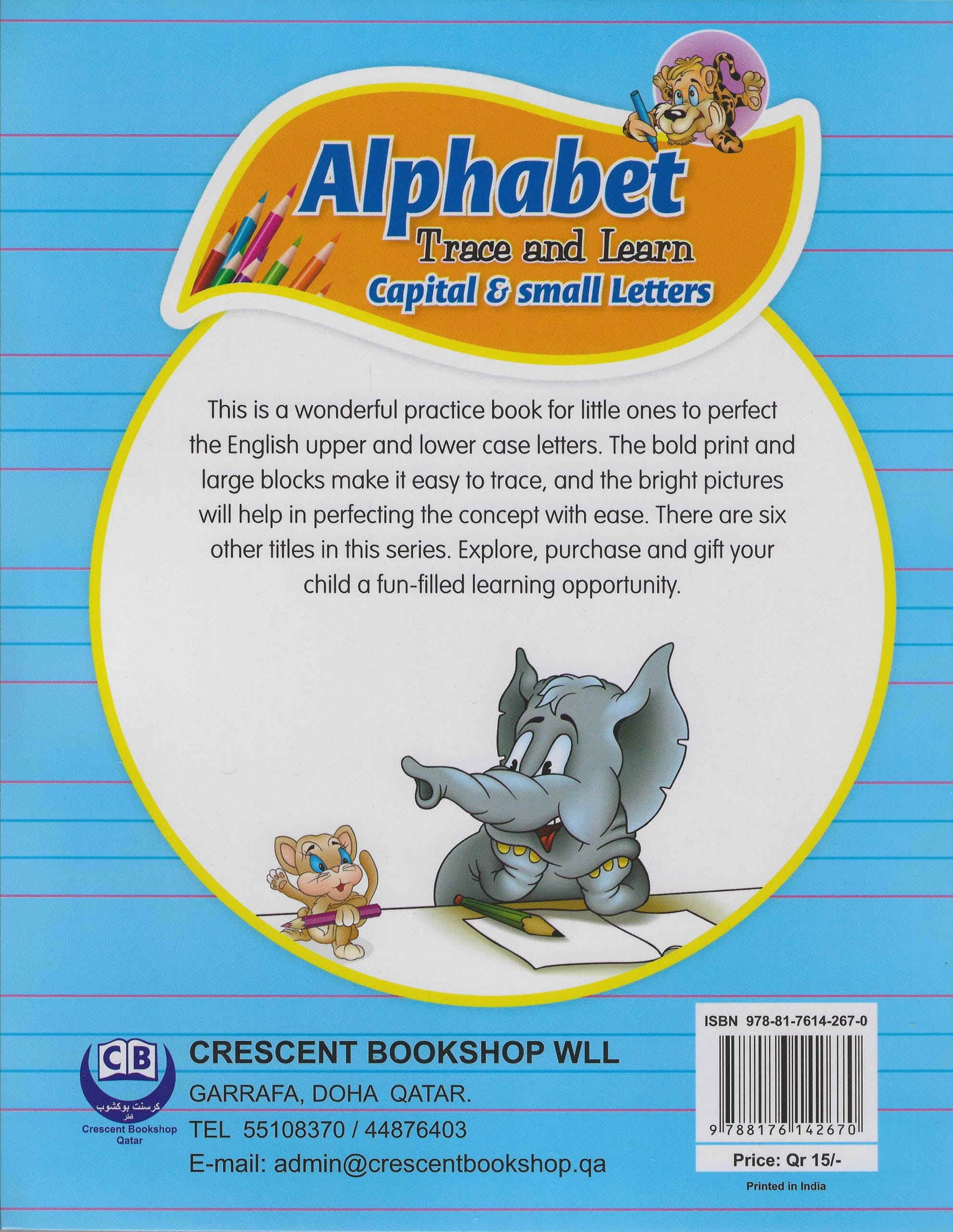 This is a wonderful practice book for little ones to perfect the English Upper and Lower case letters. The bold print and large blocks make it easy to trace, and the bright pictures will help in perfecting the concept with ease. There are six other titles in this series. Explore, purchase and gift your child a fun-filled learning opportunity.