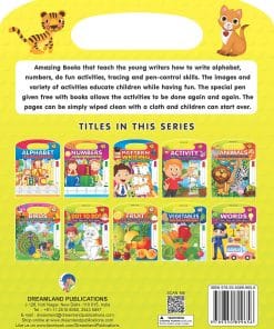 Amazing books that teach the young writers how to write alphabet,numbers,do fun activities,tracing and pen-control skills.The images and variety of activities educate children while having fun. The special pen given free with books allows the activities to be done again and again. The pages can be simply wiped clean with a cloth and children can start over.