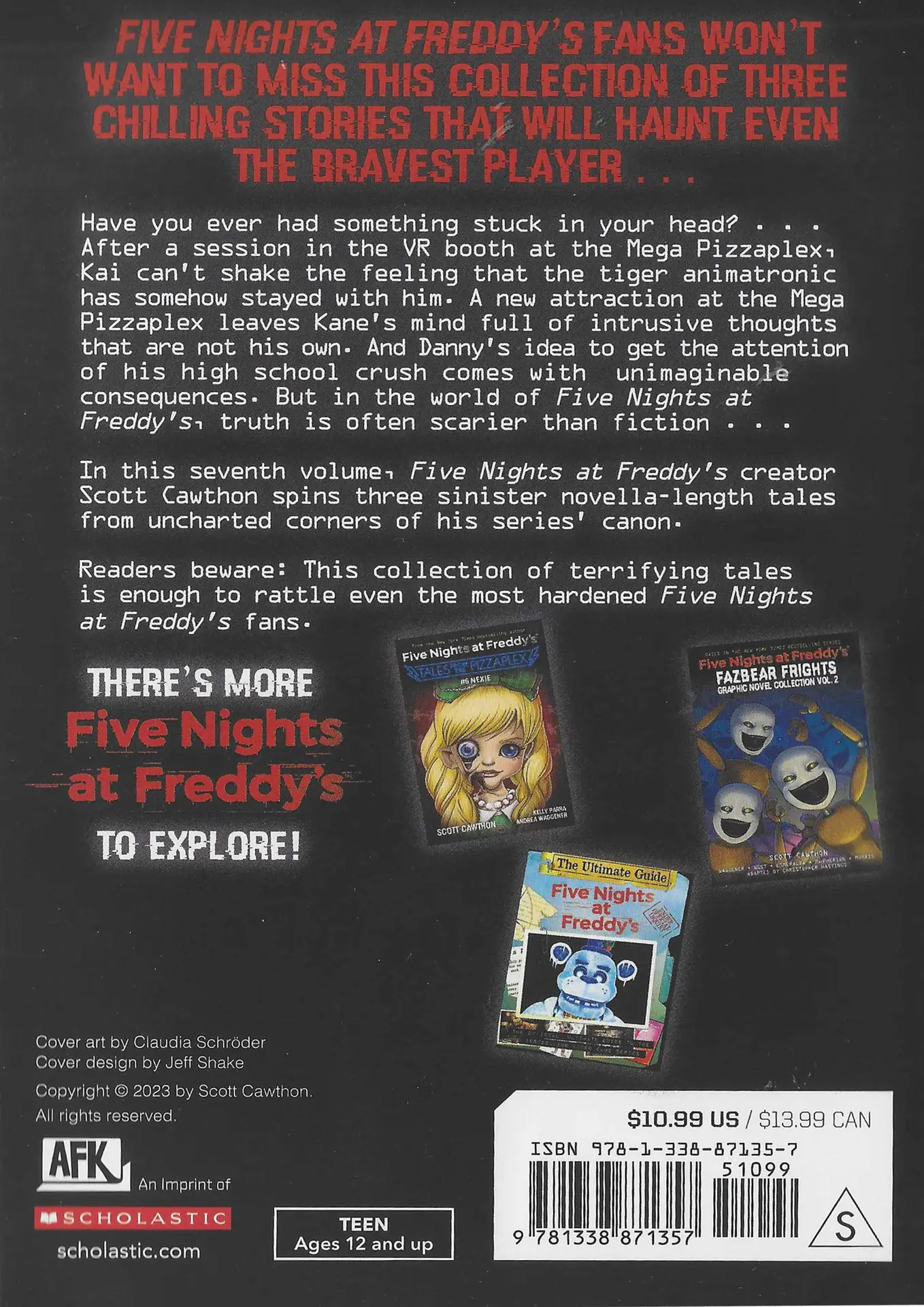 In this seventh volume, Five Nights at Freddys creator Scott Cawthon spins three sinister novella-length tales from uncharted corners of his series canon.Readers beware: This collection of terrifying tales is enough to rattle even the most hardened Five Nights at Freddys fans.