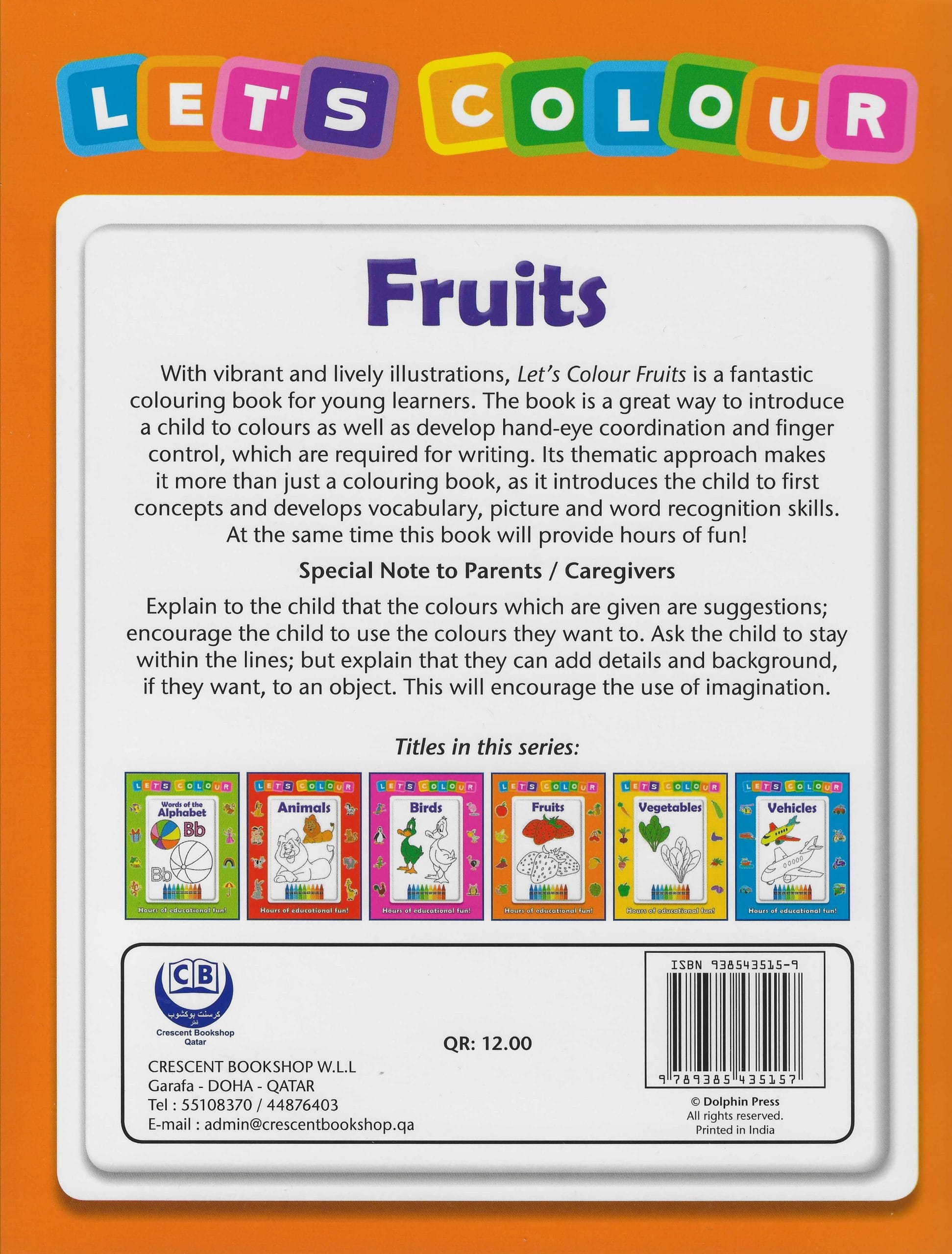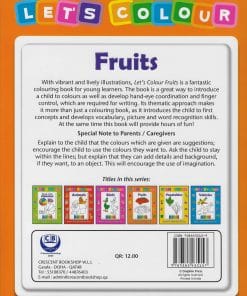 With vibrant and lively illustrations, lets color fruits is a fantastic coloring book for young learners. The book is a great way to introduce a child to colors as well as develop hand-eye coordination and finger control, which are required for writing. Its thematic approach makes it more than just a coloring book, as it introduces the child to first concepts and develops vocabulary, picture and word recognition skills. At the same time this book will provide hours of fun!