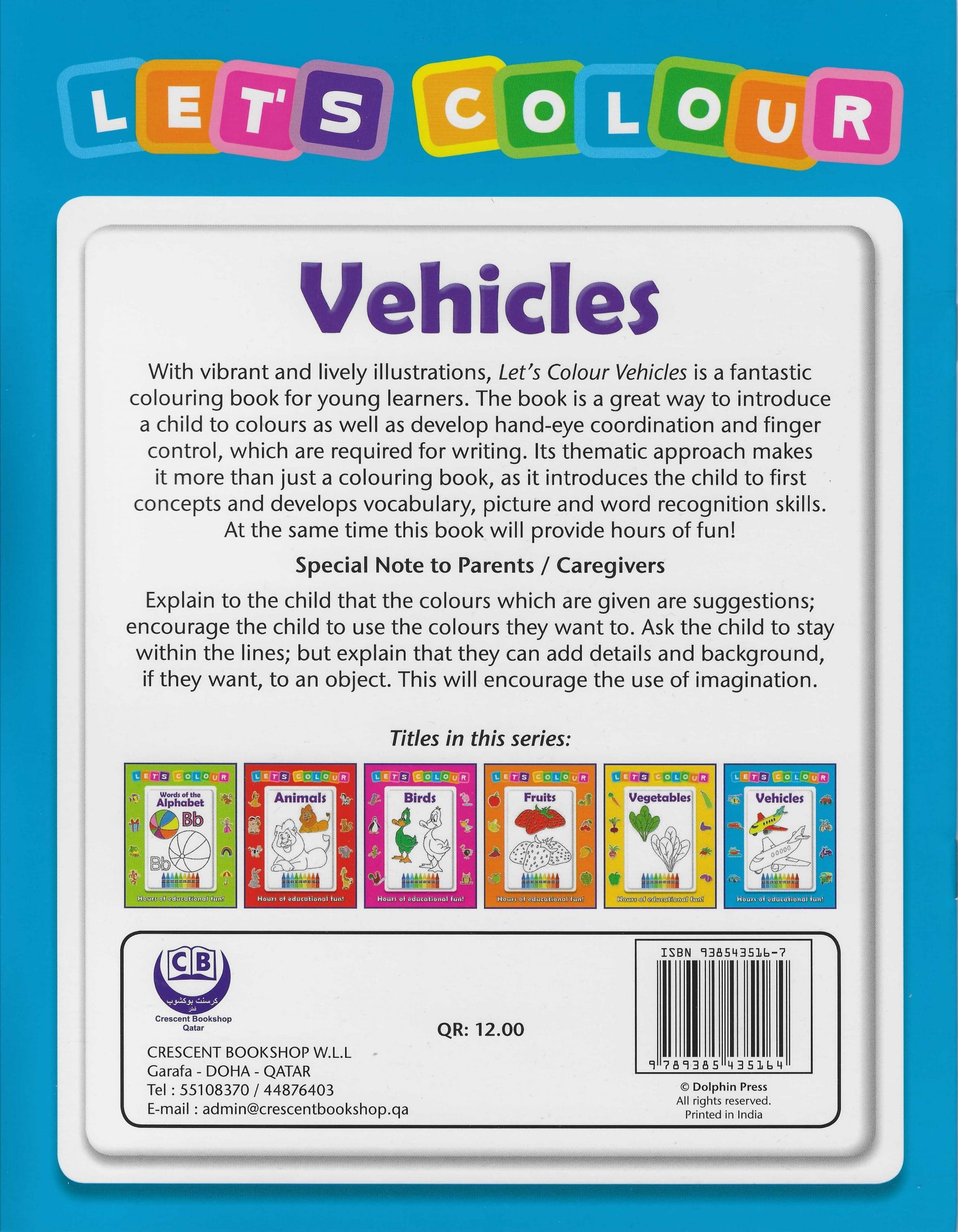 With vibrant and lively illustrations, lets color Vehicles is a fantastic coloring book for young learners. The book is a great way to introduce a child to colors as well as develop hand-eye coordination and finger control, which are required for writing. Its thematic approach makes it more than just a coloring book, as it introduces the child to first concepts and develops vocabulary, picture and word recognition skills. At the same time this book will provide hours of fun!