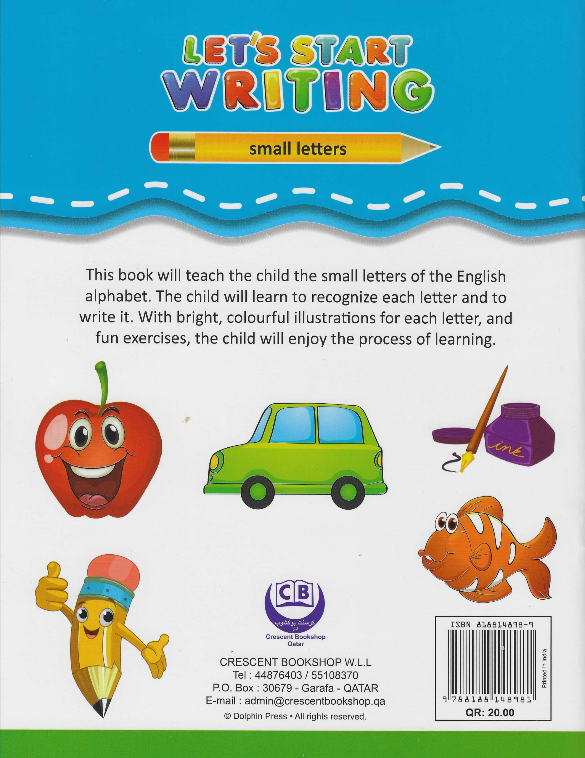 This book will teach the child the small letter for the english alphabet. The child will learn to recognize each letter and to write it. With bright,colourful illustrations for each letter, and fun exercise,the child will enjoy the process of learning.