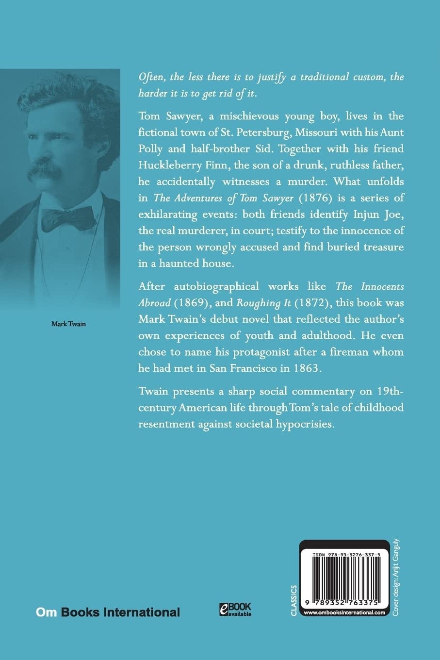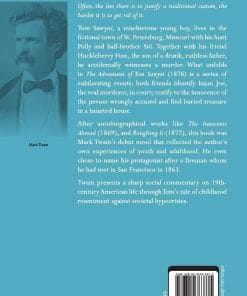 “Tom Sawyer, a mischievous young boy, lives in the fictional town of St. Petersburg, Missouri with his aunt Polly and half-brother Sid. Together with his friend Huckleberry Finn, the son of a drunk, ruthless father, he accidentally witnesses a murder. What unfolds in the adventures of Tom Sawyer (1876) is a series of exhilarating events: both friends identify injun Joe, the real murderer, in Court; testify to the innocence of the person wrongly accused and find buried treasure in a haunted house. After autobiographical works like the innocents abroad (1869), and roughing it (1872), This book was mark Twain debut novel that reflected the authors own experiences of youth and adulthood. He even chose to name his protagonist after a fireman whom he had met in San Francisco in 1863. Twain presents a sharp social commentary on 19th-century American life through Toms tale of childhood resentment against societal hypocrisies.”.