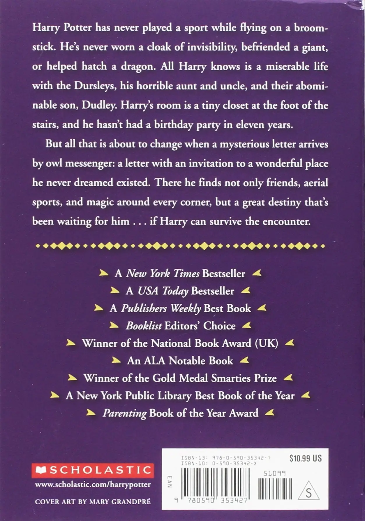 Harry Potter has never been the star of a Quidditch team, scoring points while riding a broom far above the ground. He knows no spells, has never helped to hatch a dragon, and has never worn a cloak of invisibility.All he knows is a miserable life with the Dursleys, his horrible aunt and uncle, and their abominable son, Dudley – a great big swollen spoiled bully. Harry’s room is a tiny closet at the foot of the stairs, and he hasn’t had a birthday party in eleven years.But all that is about to change when a mysterious letter arrives by owl messenger: a letter with an invitation to an incredible place that Harry – and anyone who reads about him – will find unforgettable.For it’s there that he finds not only friends, aerial sports, and magic in everything from classes to meals, but a great destiny that’s been waiting for him… if Harry can survive the encounter.