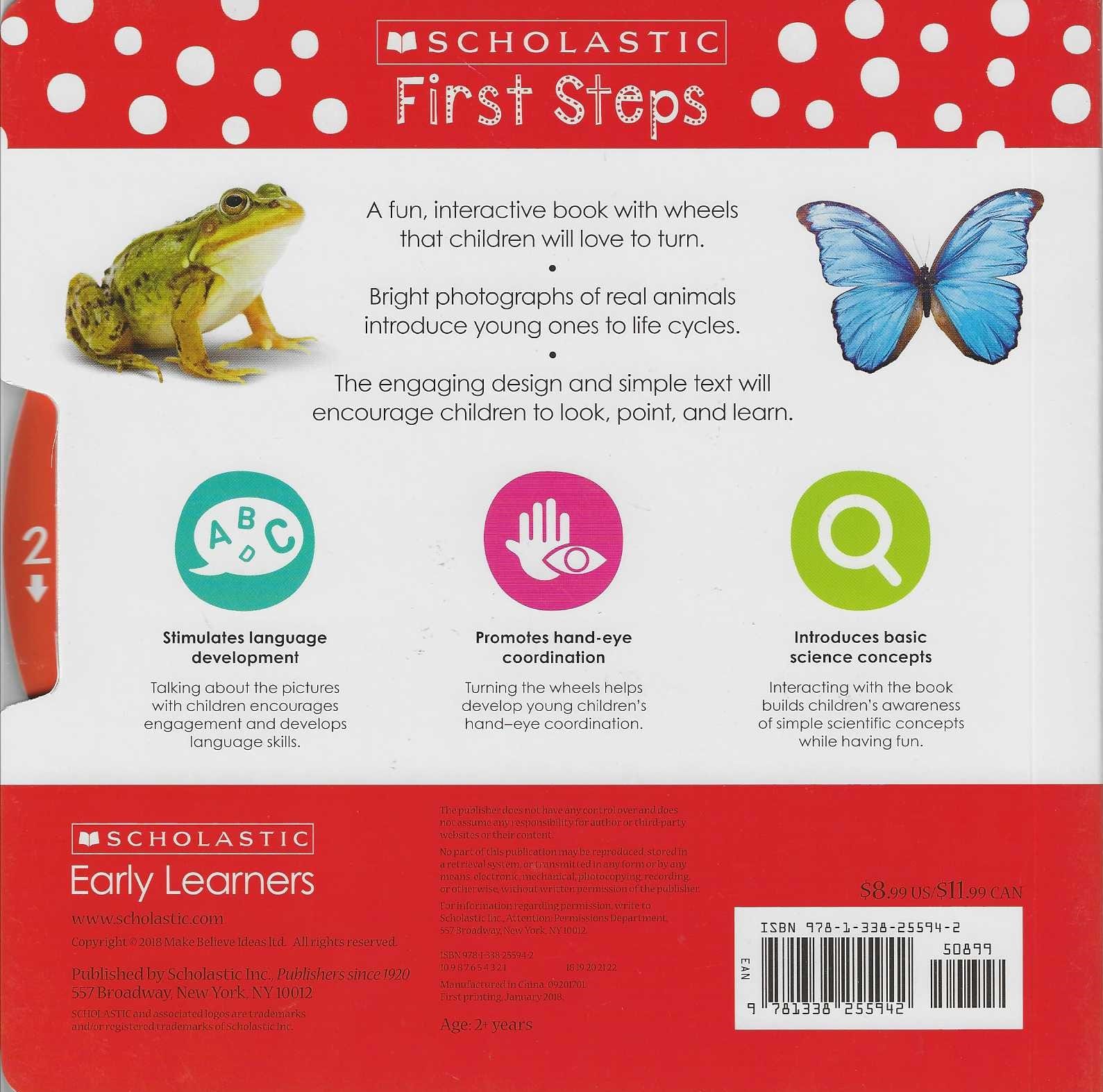 An exciting new series of early learning novelty board books that combine Scholastic’s strength in learning with beautiful photography and clear designs to stimulate early learning. Watch Me Grow! is a delightful introduction to life cycles for very young children just learning about the world around them. The book includes rotating wheels that can be turned to reveal the stages in five different life cycles: butterfly, ladybug, frog, bird, and puppy. Bright photographs of real animals combined with charming illustrations create pages that will instantly appeal to young readers interested in nature and science!